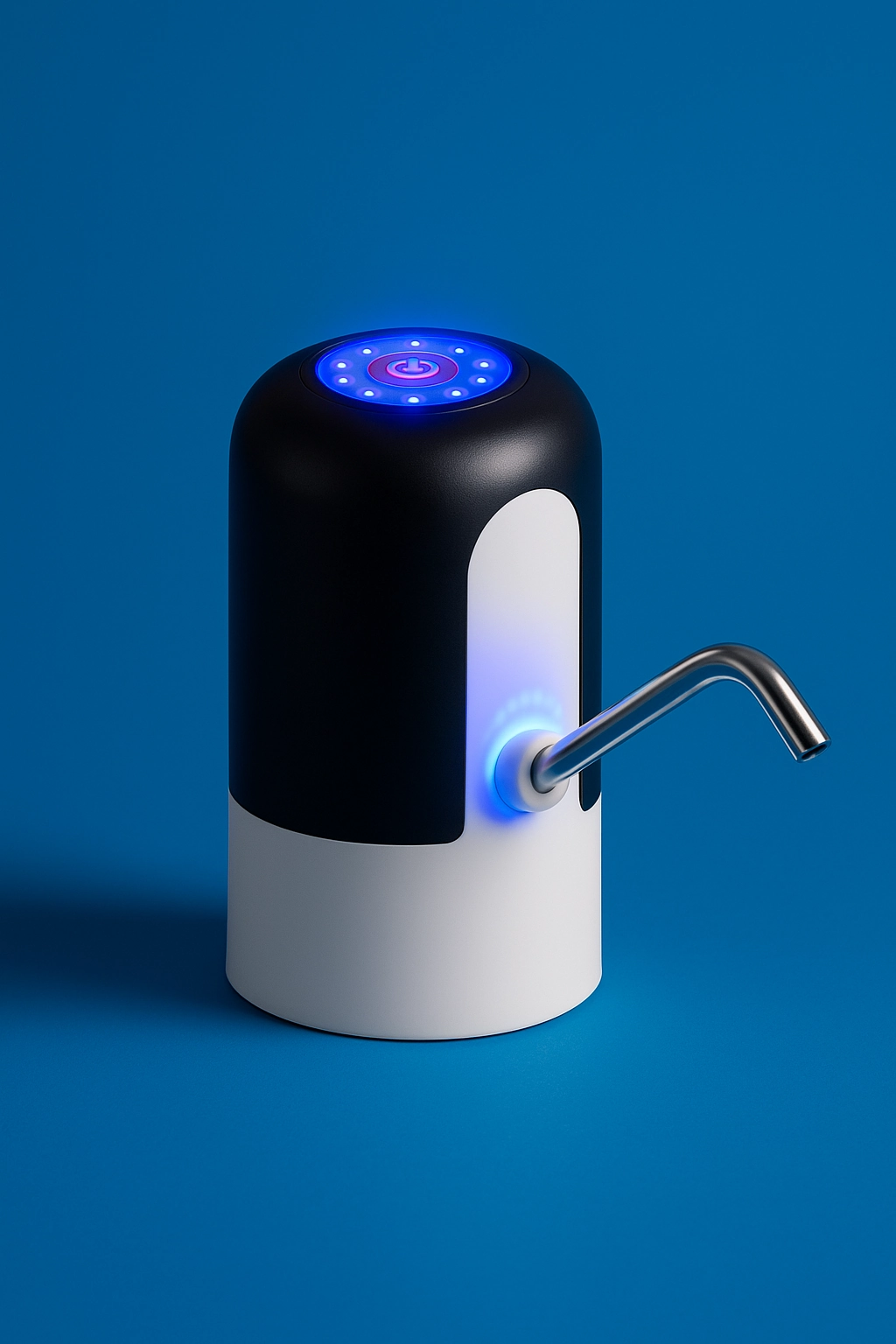 L’HydroPulse Neo est une pompe à eau automatique de nouvelle génération, conçue pour offrir à la fois performance, design futuriste et confort d’utilisation. Son corps bicolore noir et blanc, combiné à un éclairage LED circulaire bleu sur le dessus et autour de l’embout, attire immédiatement l’œil. Elle est équipée d’un bouton tactile rétroéclairé, qui permet un contrôle intuitif et rapide, même dans l’obscurité.